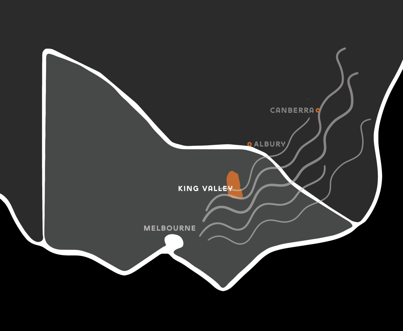 Although generally classified as cool continental, warm days in the King Valley in the ripening season are balanced by cool nights. The microclimates in the region vary from the valley floor where it is moderate, through to the upper slopes which can be an almost marginal temperature. The soils are mostly a deep red clay loam, which helps provide generosity of flavour. The region is quite large, but most of the vineyard are on gentle slopes, facing north and northeast, exposed to long sunshine hours bumping up complexity and ripening capabilities even in cooler years.